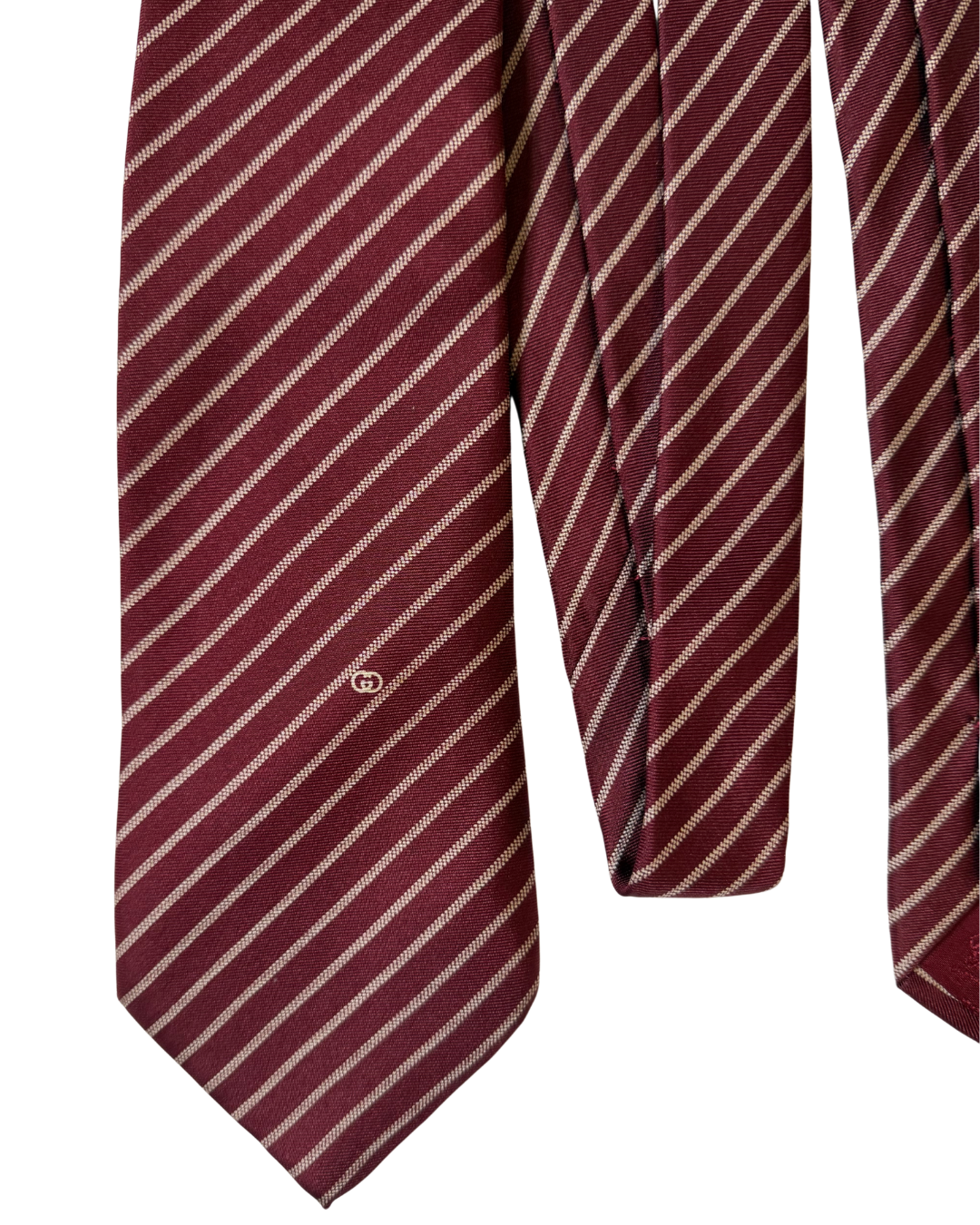 Gucci vintage silk tie featuring a stripe pattern in deep burgundy and taupe. A subtle embroidered interlocking-G adds a signature touch. Perfect for collectors, vintage lovers, and anyone looking to add a polished statement to a tailored look.
